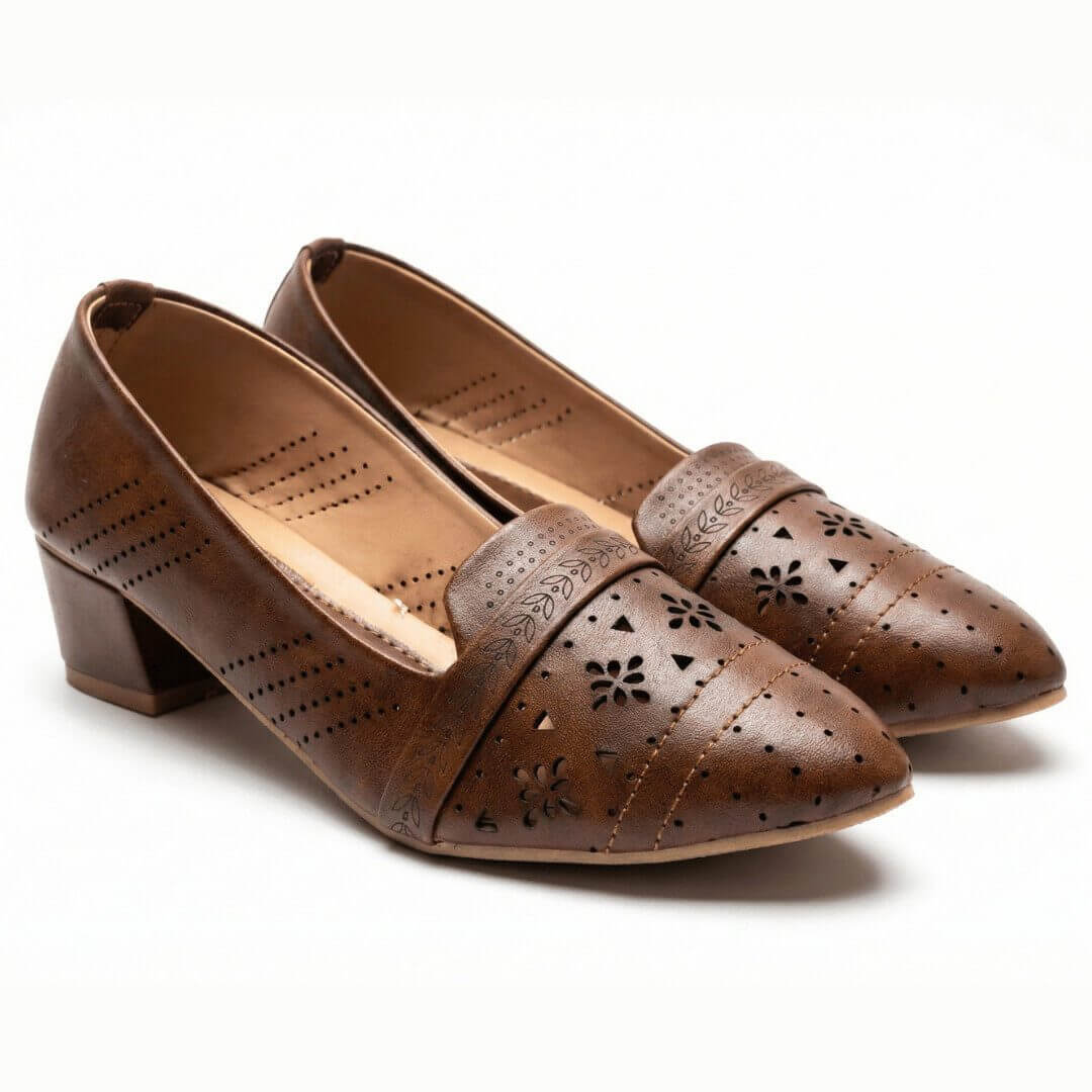 Step into smart everyday style with ZIYA Brown Perforated Work Heels, featuring a tapered toe, subtle perforated pattern, and clean loafer-style upper for a polished office-ready look. The mid block heel and cushioned insole offer stable support, keeping you comfortable through commutes, meetings, and after-work plans.